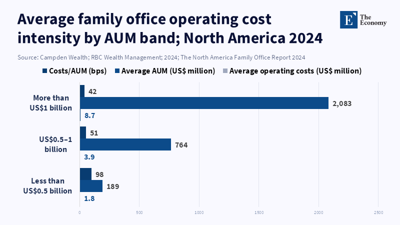 The cost figures emphasize the aforementioned. While a family office with under 500 million dollars under management averaged costs of about 98 basis points relative to assets, one with over 1 billion dollars managed approximately 42 basis points in costs. Typically, smaller entities average around 6 employees; larger ones may employ significantly more, along with more comprehensive internal teams. Small entities utilize larger external inputs into their costs. Market structure is a direct beneficiary of this phenomenon; small entities find it difficult to sustain full internal teams for investing, tax, reporting, and administration concurrently, so they outsource a portion of their services. The more outsourcing agreements a family office is part of, the greater the demand for a coherent system to manage relationships among vendors, banks, advisors, and asset managers. The price is higher for weak coordination within family offices.
