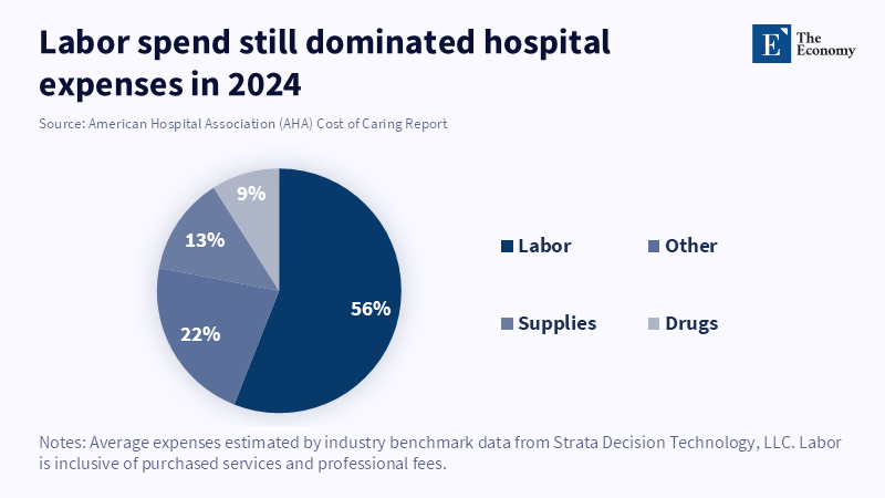 Labor was also 56% of hospitals' expenditures in 2024, or roughly 890 billion dollars, and the avowed new positions for enrolled nurses increased by an inflation,adjusted 26.6% in the 4 years prior. 129 gone by, and the campaign wages for enrolled nurses gained by inflation, adjusted 26.6% more than high-end footwear in the 4 years prior. There is no problem overlooked. It is the fundamental cost profile of the house. When labor becomes the highest cost and the scarcest input, health becomes a "service" business.