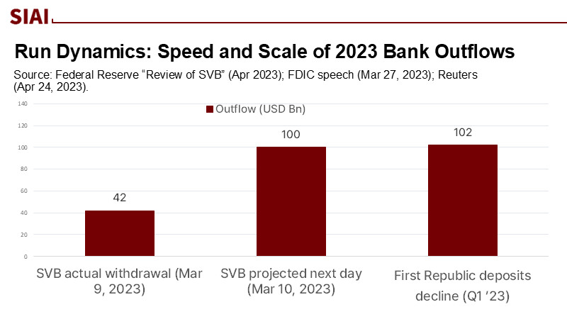 Speed is now crucial. The Federal Reserve's review recorded more than $40 billion leaving on March 9 alone, with over $100 billion expected on March 10 if conditions did not change. This is much faster than traditional cases. First Republic then revealed over $100 billion in quarterly outflows, with an estimated $25 to $40 billion departing in single days during peak stress. Coordinated messaging among concentrated depositor networks clearly played a role. This is what the bridge taught us: small, rational individual actions, synchronized by feedback, create forces the structure wasn't built to withstand. Dampers must evolve as well.