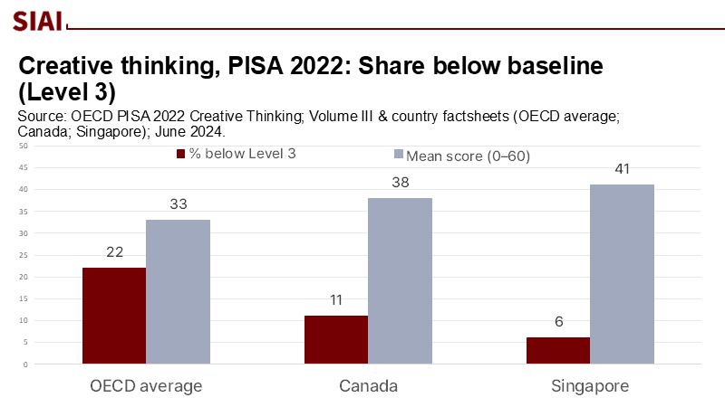 When we compare student abilities, we see the tension. In PISA 2022's first creative-thinking assessment, Singapore led with a mean score of 41/60; the OECD average was 33, and about one in five students couldn't complete simpler ideation tasks. Creative-thinking performance correlates with reading and math, but not as closely as those core areas relate to each other, suggesting that both practice and teaching—not just content knowledge—shape ideation skills. If AI speeds up production but our system does not clearly teach and evaluate creative thinking, students will continue to outsource the very steps we neglect.