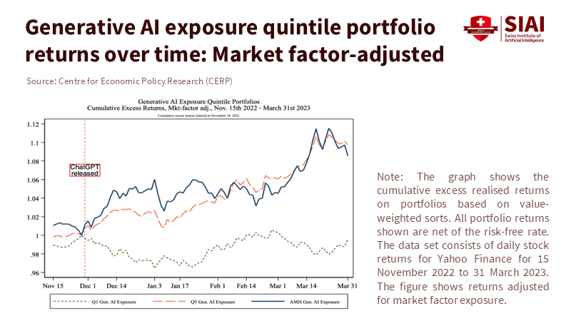 Traditional valuation maintains that price equals the discounted value of expected cash flows, adjusted for risk by a reasonable rate. This approach works well in stable markets but struggles when a technological shock changes constraints quickly than accounting can keep up. The current AI cycle is less about today’s profits and more about securing three interconnected scarcities—compute, energy, and high-quality data. Additionally, it is about capturing user attention, which transforms these inputs into platforms. In this environment, supply-and-demand dynamics take over: when capacity is limited and switching costs rise through ecosystems, prices surpass “intrinsic value.” This happens because having the option to participate tomorrow becomes valuable today. A now-well-known analysis found that companies with workforces more tied to generative AI saw significant excess returns in the two weeks following ChatGPT’s release. This pattern aligns with investors paying upfront for a quasi-option on future productivity gains, even before those gains appear in the income statements.