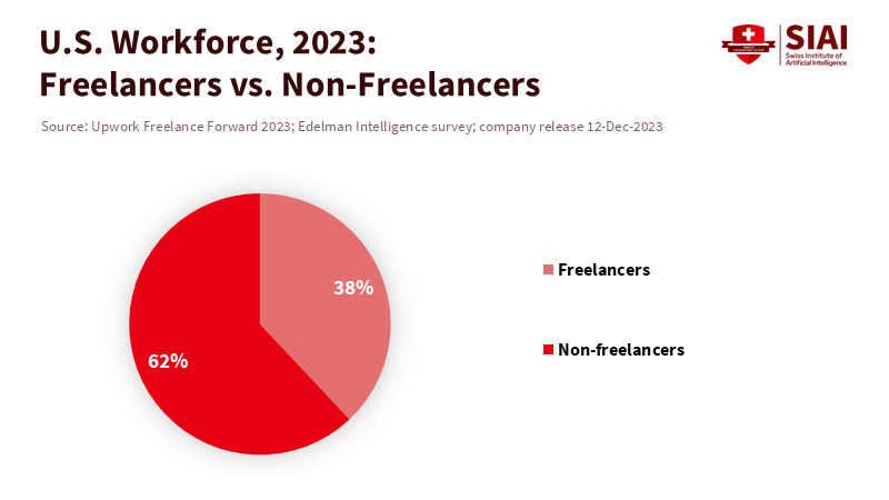 Hiring practices are already reflecting this shift. Data from platforms show that remote and cross-border hiring increased through 2024. Over 80% of roles on one global platform were classified as remote, and cross-border hiring rose by about 42% year-over-year. In the United States alone, 64 million people—or 38% of the workforce—freelanced in 2023, many serving clients they never met in person. These trends, coupled with the surge in digitally delivered services, confirm that borderless AI labor has scale and momentum.
