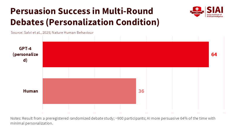 Second, persuasion is now measurable at scale. The 2025 Nature Human Behaviour study had around 900 participants engage in multi-round debates and found that large language models not only kept pace but also outperformed human persuaders 64% of the time with minimal personalization. The preregistered analysis revealed an 81.7% increase in the likelihood of changing agreement compared to human opponents in that personalized setting. Debate is a group game with feedback: arguments change the state, which influences subsequent arguments. This is where Parrondo's effects come into play, and the data suggest that AI can uncover winning combinations among rhetorical strategies that might appear weak when viewed in isolation. This is a strong capability for tutoring and civic education—if we can demonstrate improvements without undermining autonomy or trust. Conversely, it raises concerns for assessment integrity, media literacy, and platform governance.