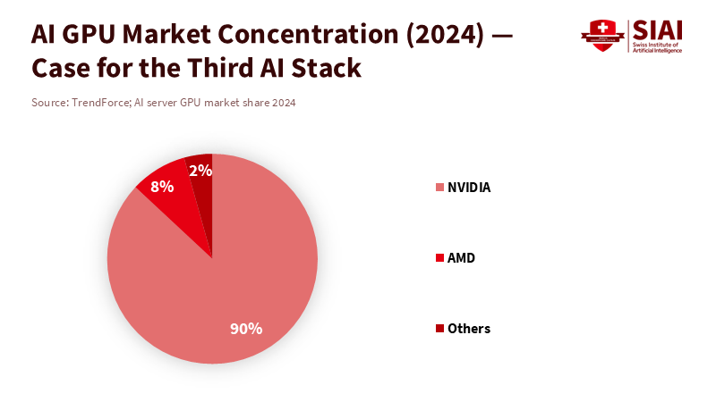 The market for advanced AI is concentrating where it counts most: accelerator hardware and the software that keeps users dependent on it. Analysts estimate that training costs for cutting-edge systems have increased by four to five times annually since 2010. The latest compute-intensive runs have exceeded 10^26 floating-point operations. TrendForce reports that, across all types of AI server accelerators, one vendor holds a significant market share, nearing 90 percent in GPU sales alone. This isn't a critique of success; it's a warning about potential bottlenecks and the erosion of bargaining power. When compute, essential frameworks, and curated data reside within a few proprietary stacks, public-interest applications—like multilingual tutoring, teacher planning, and assessment research—get sidelined or priced out. A third AI stack would provide public and cooperative infrastructure to ensure basic access to compute, data protection that protects privacy, and safety evaluations. Without it, education systems will struggle, buying isolated solutions while missing the chance to influence foundational resources.