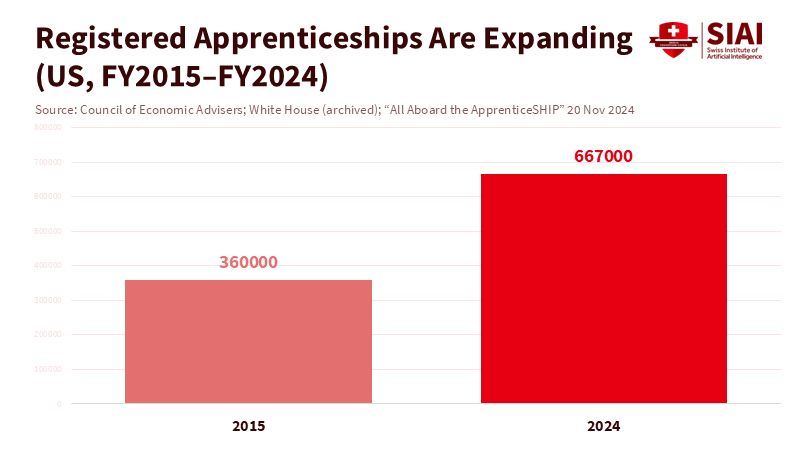 Community colleges should drive skills-first hiring efforts. They are closest to local employers and can quickly refresh programs. The model is straightforward. Assess local task demand. Work with employers to design AI workflows. Teach these workflows along with relevant theory. Evaluate using real work examples. Publish results. Each micro-credential should connect to a role with earning potential, and schools should track placement and earnings. Apprenticeships should cover not only trades but also fields such as data, healthcare, logistics, and green jobs. Statistics show this is achievable. Youth apprenticeships have increased in the United States, both in number and percentage of participants, with tens of thousands added since 2020. A skills-first hiring strategy is more effective when paid learning is common, not the exception.