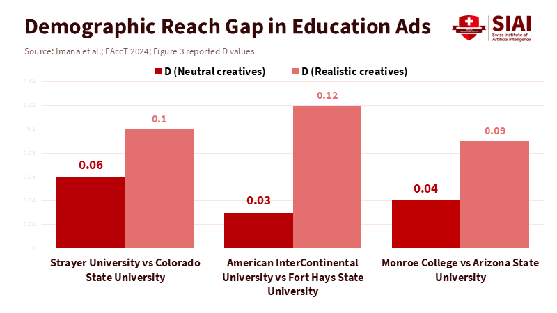 Education deserves special attention. The 2024 audit found that ads for for-profit colleges reached a larger share of Black users than public university ads, aligning with longstanding enrollment differences—about 25% Black enrollment in the for-profit sector versus roughly 14% in public colleges, based on data from the College Scorecard used by the researchers. This history helps clarify the observed biases but does not justify them. The appropriate response is to require education and delivery to meet clear fairness standards—perhaps a variance limit similar to housing—and to publish compliance metrics. This respects that optimization is probabilistic and commercial while demanding equal access to information about public opportunities.