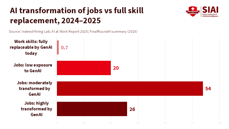 New research from Indeed, summarized in an AI skill transformation index, further supports this view. By examining nearly 3,000 work skills in job postings from May 2024 to April 2025, the team estimates that 26% of jobs will undergo significant changes due to AI, 54% will see moderate changes, and 20% will have low exposure to AI. Yet only 0.7% of skills are considered fully replaceable today. Software development, data and analytics, accounting, marketing, and administrative assistance rank among the most affected groups, with two-thirds to four-fifths of their tasks potentially being supported by AI. Still, job postings in many of these categories remain stable or evolve, indicating that employers are redesigning roles instead of eliminating them. When AI job market data and exposure models are analyzed together, the consistent message leans more toward "significant task reshuffling" rather than "mass unemployment."