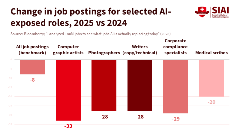 The 8% decrease in job postings identified in a recent analysis of 180 million global vacancies establishes the context: labor demand is cooling, but not collapsing. Within this context, specific roles at risk of being replaced by AI stand out. Postings for computer graphic artists dropped by 33% in 2025, while those for photographers and writers fell by 28%, following similar declines the year prior. Jobs for journalists and reporters decreased by 22%, and public relations specialists saw a 21% decline. These are not vague categories; they represent the execution end of creative work, where tasks often involve producing large volumes of images or text based on a brief. The data indicates that when AI reduces the cost of that output, employers require fewer entry-level workers, even as they continue to hire designers and product teams engaged in research, client interaction, and strategic decisions.