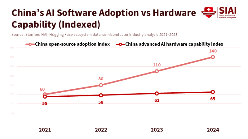 But this competitive win has limits. Open models need inference capacity to power commercial services at scale. When the highest-performance accelerators are absent or restricted, the economics and latency of large-scale services change. China’s response has been to develop indigenous chips and high-volume data center capacity. Early chips are serviceable and serve many workloads well, but independent analyses suggest they lag top-tier Nvidia chips in raw throughput and capability—sometimes by margins that matter for the most demanding training and inference uses. The engineering deficit combines node-level performance gaps with deficits in software maturity: compiler toolchains, distributed training orchestration, and optimized kernels are hard to replicate quickly. Engineers can reduce gaps over time, but these gaps interact with supply chains and standards in ways that compound the incumbent's advantage.