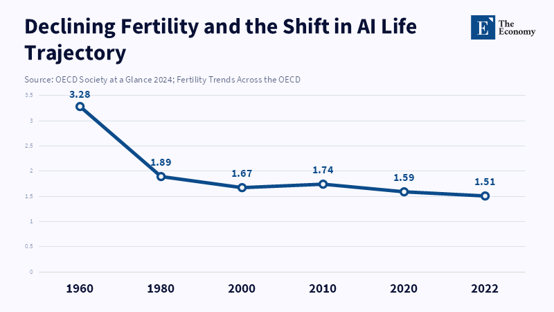 Across the world's richest countries, the traditional path from school to employment to family is no longer working as it once did. Birth rates in developed countries have fallen below the level required to maintain population stability. In 2022, the average was about 1.5 kids per woman, a big drop from the 3.3 average in 1960. People are waiting longer to have their first child, at around age 31. These changes in population were already underway, but now they're encountering significant shifts in the job market due to AI and automation taking over some jobs. AI is changing the nature of work and making it harder for young people to obtain stable employment early in their careers, resulting in greater uncertainty. These aren't merely financial issues; they affect where people live, whom they marry, their relationships, and how they plan for the future. When work isn't a reliable foundation for life, people reconsider when to marry, whether to have children, and even where to live and how to contribute to their communities. So, the challenge for governments isn't just about jobs anymore. It concerns the overall structure of adult life.