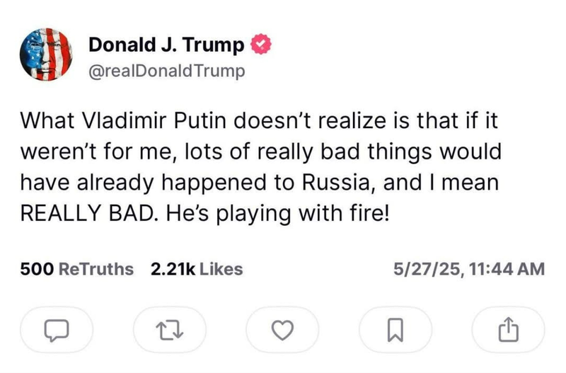 Speaking to reporters in New Jersey during the Memorial Day weekend, Trump said, “I’ve known President Putin for a long time, but he seems like a completely different person now.” He continued, “I don’t know what he’s gotten himself into, but he’s killing a lot of people.” Later, through a post on Truth Social, he wrote, “Putin is launching missiles and drones at Ukraine for no reason. He’s always said he wants the whole of Ukraine, and now that’s turning out to be true.”