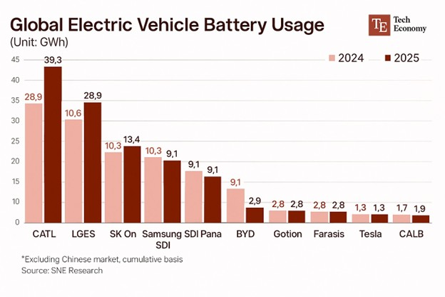 Korea’s Top 3 Battery Firms See Market Share Drop from 44.1% to 39% China Grips Material Supply Chain, Rapidly Advances in Technology Structural Weakening Visible Across Both Upstream and Downstream Industries