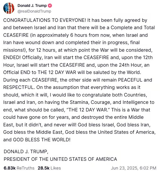 On June 22 (local time), U.S. President Donald Trump announced via his social media platform Truth Social around 6 p.m. Eastern Time that “Israel and Iran have agreed to implement a complete and total ceasefire,” adding that “the war will officially end 24 hours from now.” He further explained, “The ceasefire will begin six hours after both sides complete their current final operations and withdraw. Iran will initiate the ceasefire, and 12 hours later, Israel will follow.”