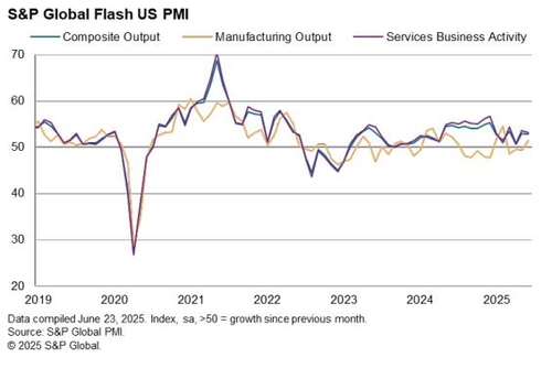 Despite loud warnings about the economic damage tariffs might cause, the latest data suggests that the U.S. economy remains fundamentally resilient — at least for now. According to S&P Global’s preliminary report released on June 23, the U.S. Services Purchasing Managers' Index (PMI) for June came in at 53.1, only slightly below May’s 53.7, signaling ongoing expansion despite a mild slowdown. The Manufacturing PMI remained unchanged at 52.0, holding steady at its highest level in 15 months, a reflection of stable industrial activity.
