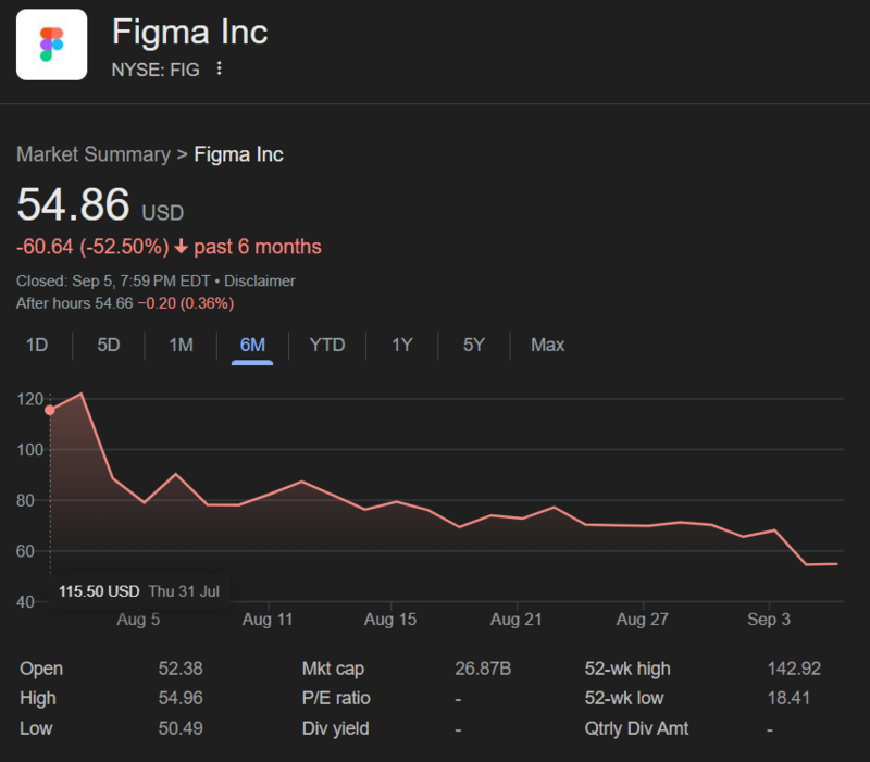 On its IPO debut on July 31, Figma shares soared 250% from the opening price, reaching a peak of $122 on August 1. Since then, however, the stock has fallen 41% in about a month. Including the latest after-hours plunge, the decline now amounts to 52.1% from the peak.