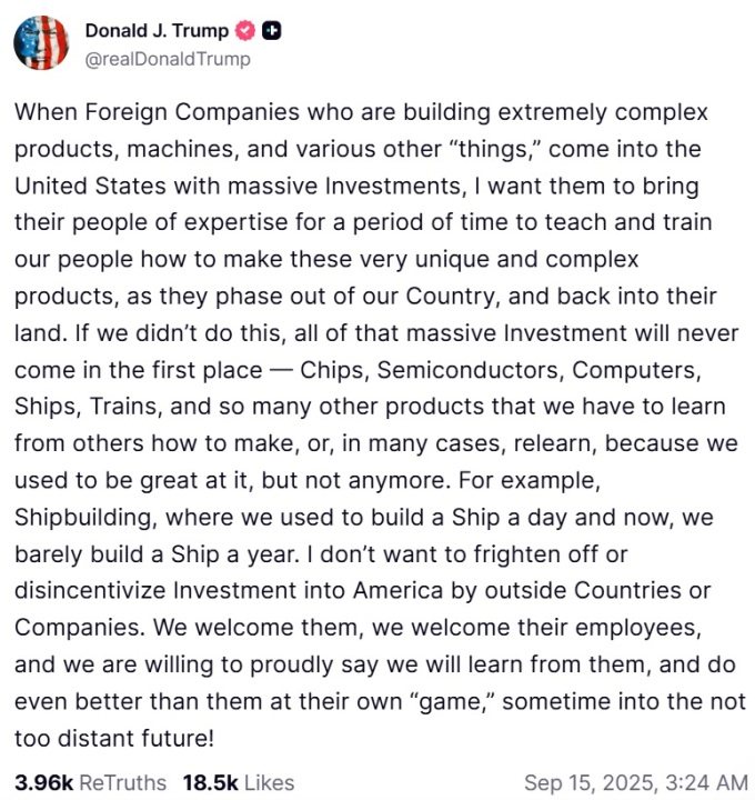 On the 14th, President Trump wrote on his social media platform Truth Social: “When foreign companies that manufacture highly complex products and machinery make massive investments in America, I want them to bring their experts so they can teach and train our people.” He called on foreign investors to station experts in the U.S. for a period of time to train American workers before gradually withdrawing. Trump warned, “Otherwise, all of those large-scale investments would never have been made to begin with.”