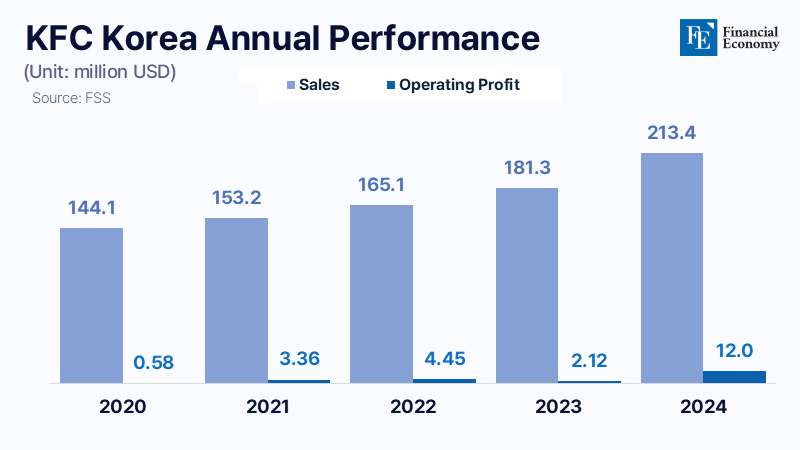 The prolonged slump stemmed largely from its decades-old company-owned store model, under which the headquarters directly bears labor and rent costs, suppressing profitability compared with franchise-based peers. It also restricted aggressive expansion. Whereas Lotteria and Mom’s Touch each operate over 1,000 outlets nationwide, KFC’s footprint fell short of 200 stores by end-2023.
