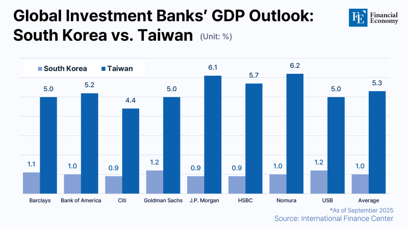 In contrast, South Korea’s average growth forecast stands at 1.0%, barely escaping sub-zero territory. UBS and Goldman Sachs expect 1.2%, Barclays sees 1.1%, while J.P. Morgan and HSBC project 0.9%, and Citi just 0.8%. Consequently, Korea’s per-capita GDP is expected to reach $37,430, trailing Taiwan’s $38,066 for the first time. With the won-dollar exchange rate hovering near 1,400, IBs warn that the gap could widen further if the currency remains weak.