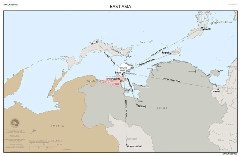 Korea’s strategic value is often illustrated by the “inverted East Asia map” used in U.S. Forces Korea training materials. Centered on the Korean Peninsula, it visually compresses Taiwan and the Philippines near China’s coastline and marks straight-line distances from Camp Humphreys (Pyeongtaek) to key nodes—Taipei (1,425 km), Manila (2,550 km), Beijing (985 km), Tokyo (1,155 km), and Pyongyang (255 km)—reflecting how USFK could be employed under “strategic flexibility” in contingencies such as a Taiwan crisis or a South China Sea clash.