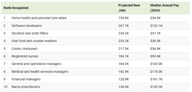 By contrast, employment tied to Age-Tech is projected to expand sharply. An analysis by Visual Capitalist, drawing on data from USAFacts and the U.S. Bureau of Labor Statistics, shows that home health aides and personal care workers will account for the largest number of new jobs created in the United States through 2034, with an estimated 739,800 additional positions over the next decade.