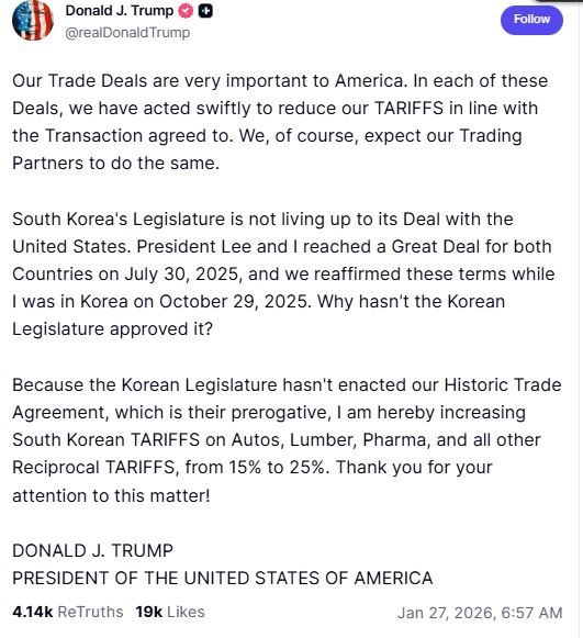 On the 26th, Trump wrote on his social media platform Truth Social that “the South Korean legislature is not honoring the agreement with South Korea,” adding that he would therefore raise reciprocal tariffs on automobiles, lumber, pharmaceuticals, and all other affected goods from 15% back to 25%. He said that he had reached a “mutually beneficial agreement” with President Lee Jae-myung on July 30 last year and reaffirmed it during a visit to South Korea in October, but that the South Korean National Assembly had failed to approve it. Framing the tariff rollback as a matter of reciprocity, Trump placed responsibility squarely on the South Korean legislature.