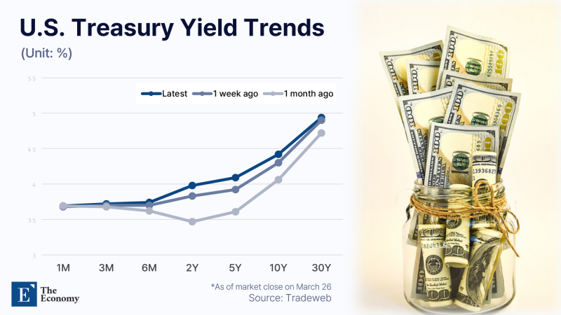According to electronic trading platform Tradeweb on March 26, the yield on the 10-year U.S. Treasury rose to 4.42% near the close of the New York session, up 0.09 percentage points from the previous day. The yield on the policy-sensitive 2-year Treasury also climbed 0.12 percentage points to 4.00%. As uncertainty stemming from the Iran conflict fuels expectations that the Federal Reserve will find it difficult to cut rates, weak demand at a 7-year Treasury auction held the same day further accelerated the sell-off in bonds.