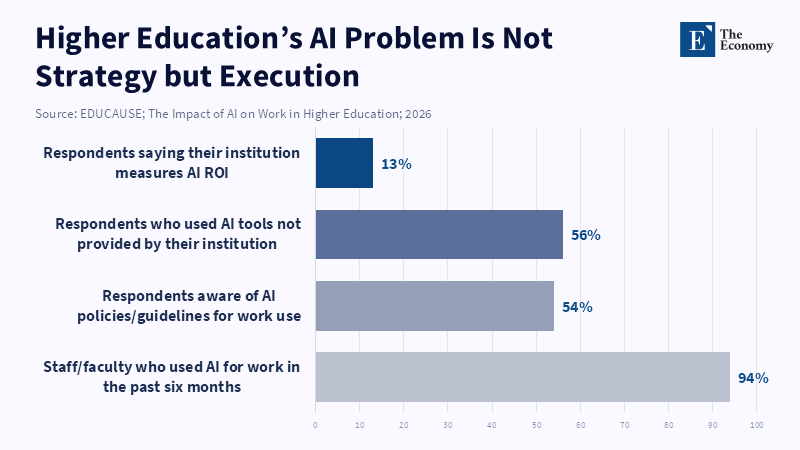 Nor does this mean an end to strategic judgment. It signals the necessity of pairing strategy with operational realities. For instance, in the EDUCAUSE 2026 work survey, the most telling number isn't that 92% of respondents say their institution has some form of an AI strategy. It is that only 13% say their institution is tracking ROI, only 54% have a policy and guide, and only 56% have operationalized tools that were not purchased. This is what failed execution looks like: adoption surpassing policies, money without accountability, and leading behaviors far behind policy. This might look like the beginning of a solution or just a different sort of consulting to some critics. In some ways, they are right. Higher ed does need less of the former. But it doesn't need less of the latter. When systems are frayed, staff lean, and changes bridge academics, techno,policing, laws, and administration, outside expertise can become an asset. It's whether that outside expertise makes an institution better, or just more acknowledged.