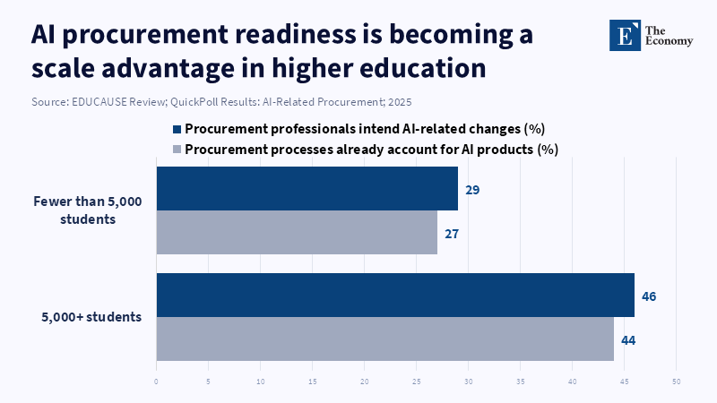 There is a snag—this approach to adoption risks expanding inequality across the sector. Big institutions are more likely to make good use of it. The EDUCAUSE report said the survey didn't give percentages as far as how big institutions approach AI and products in their purchasing processes. According to a 2024 OECD survey, institutions in some country groups that are big are now showing higher rates of current AI use in teaching and learning: for example, in Singapore, 75 percent of lower secondary teachers used AI in the last year, compared with an OECD average of 37 percent. But simply giving situational advice does not necessarily translate into broader adoption of AI or increase capacity; a digital divide can deepen if smaller colleges and public systems don't have enough staff time to scope out problems, hire specialists, and then soak up what those specialists produce. The buyers who most need effective advice can be least likely to buy it effectively.