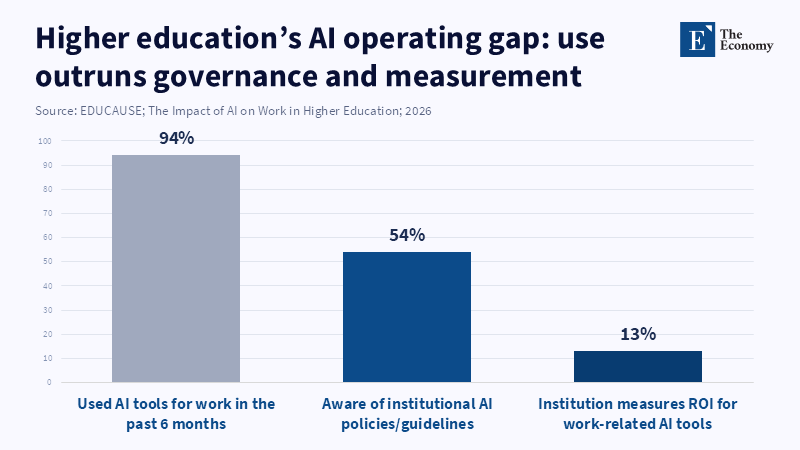 This is a power of bargaining story. Situational advisory emerges when organizations have the ability to do more for themselves and need outside help only at the margins. In higher education, that margin has been shrinking rapidly. EDUCAUSE reported in 2025 that 77 percent of respondents had some kind of AI strategy for their institutions. But only 30 percent reported that AI and analytics engagement was a top priority in data modernization. In a 2026 EDUCAUSE report, respondents reported 92 percent of their institutions were executing a work-related AI strategy, but only 13 percent reported their institutions were monitoring the ROI of those AI tools. There is a significant gap between adoption and valuation at this moment. Institutions are implementing AI, but many are not yet organized enough to value and price it.