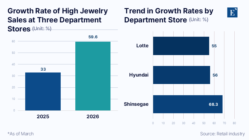 The most striking feature of the latest sales increase was the concentration in high jewelry. The three major department stores—Lotte, Shinsegae and Hyundai—posted an average 59.8% increase in high jewelry sales in March from a year earlier. Shinsegae Department Store recorded growth of 68.3%, followed by Hyundai Department Store at 56% and Lotte Department Store at 55%. Given that the average year-on-year sales growth rate for the high jewelry category at the three department stores stood at 33% for all of 2025, the March increase this year stands out markedly.