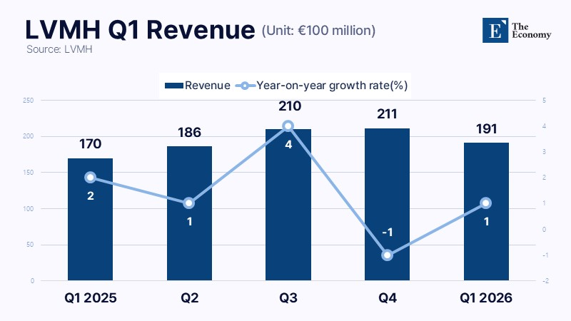 According to the Financial Times (FT) on the 26th (local time), LVMH, the world’s largest luxury conglomerate with brands including Louis Vuitton, Dior, Celine, and Tiffany, posted first-quarter revenue of $20.6 billion on a like-for-like basis, excluding scope changes and currency effects. This represents a mere 1% increase year-on-year, effectively signaling stagnation. The company noted that while there were no changes in consolidation scope, currency fluctuations reduced revenue by approximately 7%.