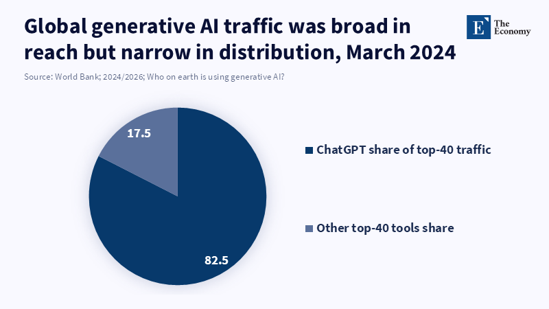 Between 2023 and 2026, the diffusion of generative AI happened at a pace that renders these structural mechanisms policy-relevant today, rather than in some envisaged future. A report from the World Bank , drawing on high-frequency traffic data, estimates that 40 leading generative AI tools were receiving roughly 3 billion monthly visits in March 2024. It also demonstrates the speed with which adoption expanded away from early high-income zones, where middle-income economies incidentally accounted for a major part of the traffic, whereas low-income economies' presence remained marginal in worldwide patterns of usage.[1] This is important because diffusion is neither politically nor economically neutral. As massive segments of the world's population use generative AI to facilitate writing, programming, editing, summarizing, data tidying, etc., the technology begins permeating cognition and output at scale: humankind adapts to the machine, not vice versa.