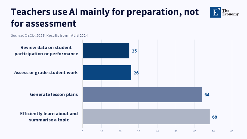 The institutional consequences of this misframing are most evident in education. AI is not a neutral classroom tool; it alters the informational landscape in which instruction takes place. The OECD’s review of generative AI governance in education argues that generative AI disrupts established pedagogical and evaluative procedures-assignment, homework, assessment-and that much of the initial scrutiny centered upon issues like cheating, the tendency to plagiarize, and "learning loss".[16] According to TALIS 2024 data, "teachers most often use" AI to "produce summaries of topics" and "support lesson planning", yet "far fewer" employ AI to "evaluate classwork", while "a considerable proportion" feel "unprepared" to teach with AI tools, and "another substantial minority" are "doubting its role in instruction".[17] The Implication for policymakers, then, is that education authorities face a technology capable of generating convincing results much faster than institutions can innovate modalities for authenticating merit. Once the evaluation framework further degrades, inequality will be exacerbated because institutions offering schooling can channel resources into tools, tutoring, and networks that assuage the existing uncertainty, while students from lower social origins will increasingly lack a one-to-one validation proxy.