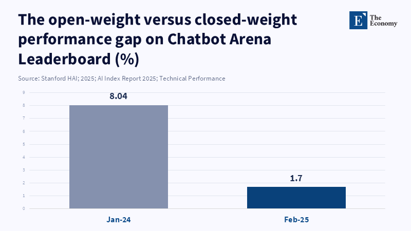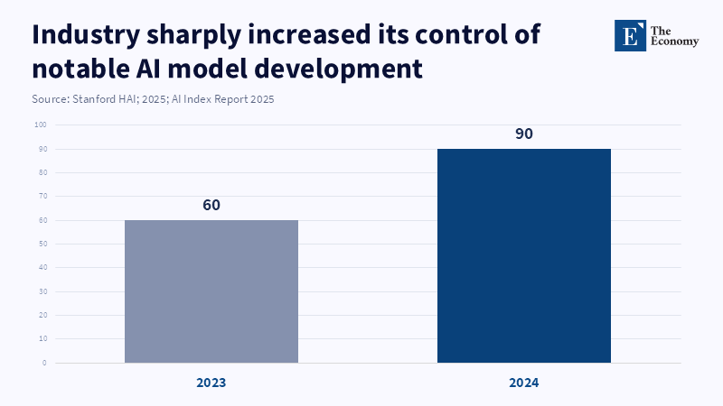The trend toward concentration is highlighted by shifts in where frontier AI development occurs. The Stanford HAI AI Index reports that nearly 90 percent of notable AI models from 2024 originated in industry, a steep increase from 2023. Academia, meanwhile, remains the primary source for highly cited research.[3] This signals a structural change: the creation of frontier models has become an industrial process, reliant upon economies of scale, proprietary infrastructure, and the financial and organizational resources to enable ongoing training. The policy takeaway is not that governments should exit the AI field, but that calculated engagement will need to evolve. Governments can still shape AI deployment, oversight, assessment, and workforce integration, even if replicating every frontier domestically is neither feasible nor desirable.