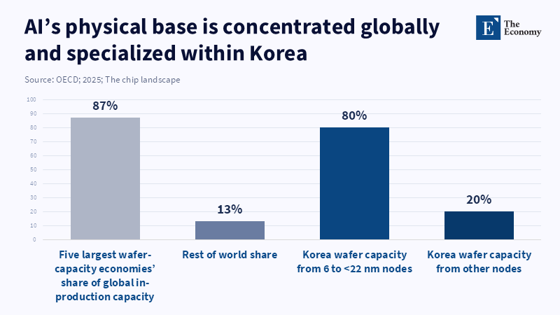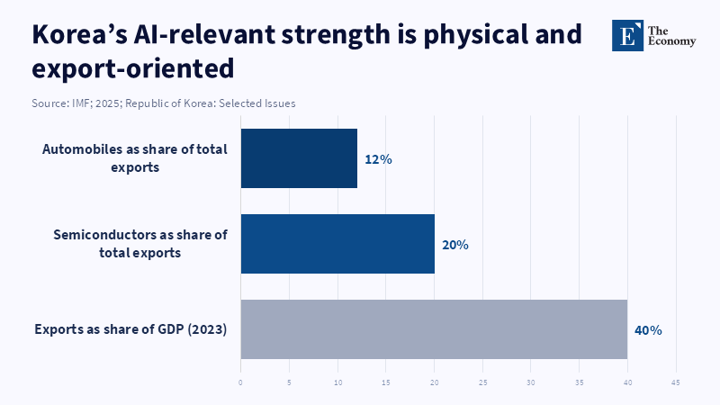 South Korea is often described as an AI adopter trying to catch up to advanced frontiers. Production-systems literature, however, finds that the special strategic function of Korea is in the physical and industrial levels of AI: semiconductors, industrial process engineering, and high-reliability production integration. A recent IMF report on Korea's trade profile points out that Korea's exports constituted about 40% of GDP in 2023, and that semiconductors and cars are the most significant Korean export items, respectively accounting for 20% and 12% of the nation's total exports.[29] The OECD chip landscape results on Korea's concentration in process node further confirm that Korea is structurally placed in a world critical part of the physical foundation of AI.[30]