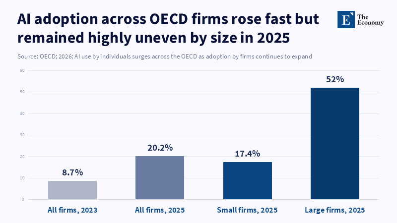 The problem of coordination is visible in these data now. OECD collects data on AI adoption among individuals and firms, which shows that AI adoption is spreading faster in OECD countries: 20.2% of firms used AI in 2025, compared to 8.7% in 2023; the adoption is very unequal among firm sizes, with large firms being considerably more likely to have adopted it than small firms.[35] And this has meant that if the governance of AI adoption does not ensure the access of smaller firms and lagging regions to the complements and standards that enable them to participate in AI diffusion, it can magnify scale economies and market power. Therefore, the question of policy becomes "not just how to deploy AI, but how to deploy AI such that it does not kill off competition, institutional trust, and skill formation."
