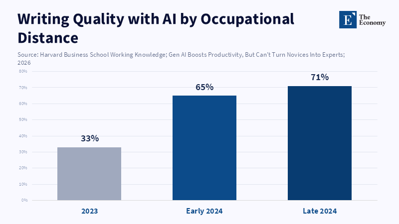 This has also been borne out empirically. In one controlled study at a financial firm, employees in marketing and engineering were assigned the task of writing investment articles using generative AI, even though the participants had limited pre-existing domain knowledge.[4] Although all participants were able to use AI to organize ideas, there was still a huge difference between participants with and without domain knowledge. According to The AI Proficiency Report, while AI tools allowed employees to take on tasks outside of their usual areas—helping marketing specialists and web analysts to produce articles—those with less experience in writing, such as IT specialists, did not achieve the same level of clarity plus competence in their work.[5] The report notes that most employees use AI for elementary tasks, showing that while AI enables workers to stretch beyond their usual roles, it does not turn novices into experts. As an author of one study states, generative AI "essentially hits a wall when people lack sufficient expertise".[6] Essentially, it comes down to the fact that if a technically proficient employee without writing or finance knowledge uses AI, the product will not be as good as if the employee were a domain-expert marketer tasked with using the tool.