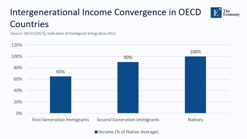 Authentic, initial earnings dips are sizable. The OECD’s 2023 Indicators of Immigrant Integration report indicates that first-generation migrants earn about 65% of natives’ pay, on average, across member states. The gap reflects not just skill mismatches but also discrimination and credential non-recognition. Yet the same dataset finds that their children close three-quarters of the gap by adulthood, reaching roughly 90% of native incomes by generation two.
