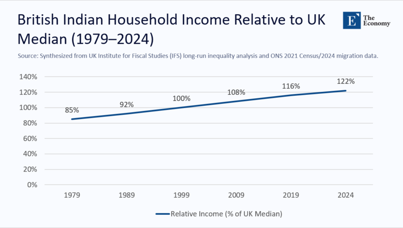 Britain offers a live demonstration of long-run convergence under maximum cultural distance. The Office for National Statistics places the resident Indian ethnic group at 1.8 million in England and Wales on the 2021 Census. It reports a further net inflow of 240,000 Indian immigrants in the year to June 2024.
