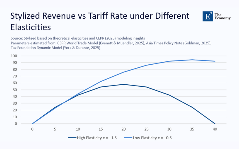 Recent quantitative work supplies the most precise map of that crest to date. A 2025 CEPR study by Simon Evenett and Marc-Andreas Muendler embeds the world economy in a rich general-equilibrium model and finds that tariff revenue maximizes at a uniform rate of nearly 15 percent. Above that line, production reshuffles so completely that additional rate hikes raise less cash, not more. A separate Asia Times policy note, published the same month, reaches a similar conclusion from a different starting point: empirical pass-through rates, profit-margin buffers, and currency movements restrict the realistic revenue sweet spot to the 10- to 15 percent band. And when the Tax Foundation feeds current trade elasticities into its dynamic scoring engine for Congress, the model predicts that a universal 20% tariff would generate less revenue over a ten-year horizon than a mid-teens levy once lost GDP and retaliation are taken into account. Three methodologies, three research teams, and one verdict: the United States hits diminishing returns almost as soon as tariffs leave the realm of single digits.