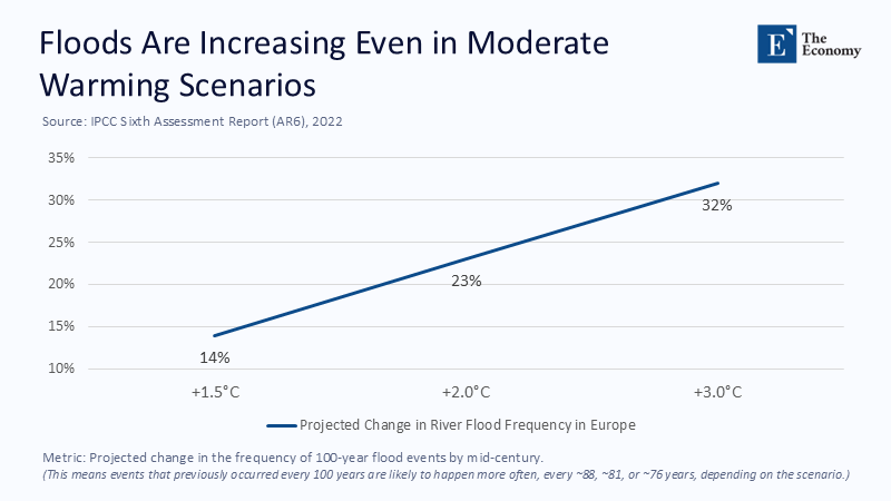 Television still cuts from Alpine towns submerged in chocolate-brown torrents to Andalusian groves cracked like old porcelain, as though the two calamities belonged to separate planets. They are, in fact, manifestations of a single malfunction. The European Environment Agency calculates that weather- and climate-related extremes stripped €162 billion from the European Union in the three short years between 2021 and 2023—more than one-fifth of all such losses recorded since 1980—and it notes that each of those three years now ranks among the five costliest in the historical record. The geography is perverse: while Central Europe scrambles to open sluice gates, the Mediterranean resorts to water-tanker convoys. The pattern shows that Europe does not suffer too much or too little water on average; it suffers from water appearing in the wrong places at the wrong time. That mistiming, not meteorology, is the actual macroeconomic risk.