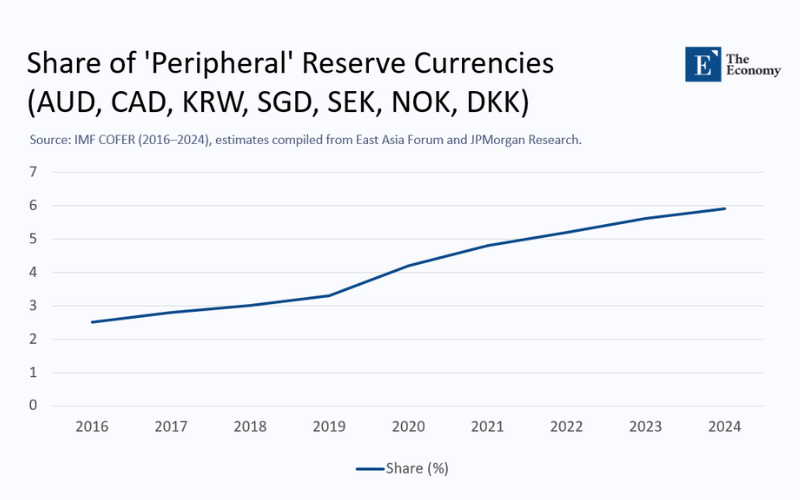 The biggest surprise in the reserve ledger is not the renminbi—it still struggles to hold a three-per-cent share because of convertibility limits—but a constellation of midsize, free-floating units. IMF data show that the combined share of the Australian dollar, Canadian dollar, Korean won, Singapore dollar, and the three Nordic currencies more than doubled from 2.5 percent in 2016 to almost 6 percent by the end of 2024.