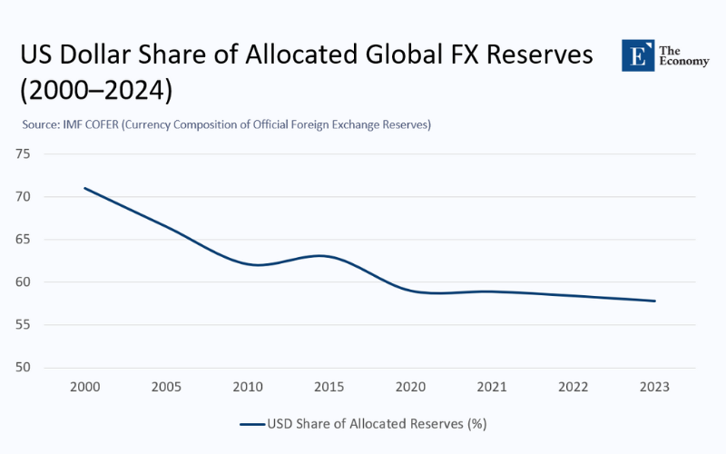 The International Monetary Fund’s COFER tables, which capture allocated reserves (those whose currency composition is reported), peg the dollar’s share at 57.39 percent in the third quarter of 2024, down more than seven percentage points from 2016. A modest mark-to-market rebound in Q4 lifted that number to 57.8 percent. Still, the trend remains unambiguous: approximately half a percentage point of market share has been lost every year for two decades, and the pace has accelerated since the onset of the pandemic.