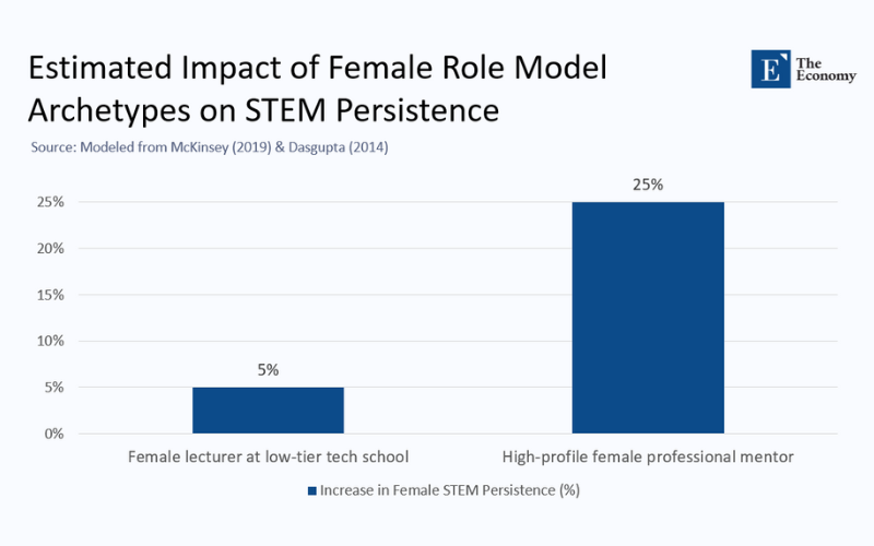 To illustrate the magnitude difference, consider the chart below, which compares estimated gains in female STEM persistence between two archetypes of role models. Low-tier teachers increase persistence by roughly five percentage points, primarily due to improved short-term confidence. The high‑profile professional mentor boosts the figure by twenty‑five points, echoing the McKinsey retention uplift. Even allowing for confidence intervals, the order‑of‑magnitude gap is unmistakable.