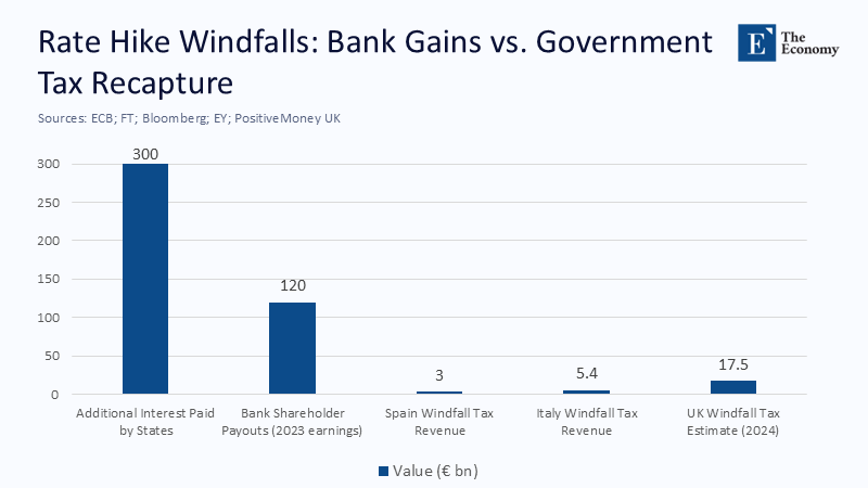 While interest rate hikes imposed a massive fiscal burden on governments, costing an estimated €300 billion in additional interest, banks reaped record profits, with shareholder payouts exceeding €120 billion. In contrast, windfall taxes recouped only a small fraction. The chart illustrates the stark imbalance in monetary policy redistribution.
