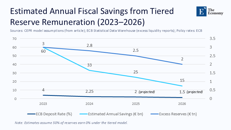Applied to the euro area, the math is compelling. With today’s €2.8 trillion excess-liquidity stock, paying zero on half would save €33 billion annually at the current 2.25 % deposit rate. Had the grid been in place during the 2023 peak, annual savings would have topped €60 billion—more than every announced national windfall tax combined.