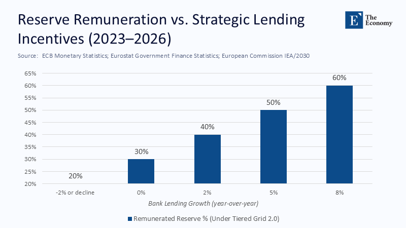 First comes a Tiered Reserve Grid 2.0. The grid examined in Part 2 would pay zero on about half the €2.8 trillion stock of excess reserves, saving thirty‑plus billion euros a year at current rates. The upgraded version would make a bank’s zero‑rate allowance conditional on how it expands targeted credit—for example, loans to small firms, renewable‑energy infrastructure, or dual‑use defense suppliers. A lender that grows such assets by five percent annually would keep the full allowance. One that lets its loan book stagnate would forfeit a larger share to the zero‑rate tier. The beauty of that rule is its symmetry: it does not punish liquidity but ends the practice of rewarding inactivity with a public annuity.
