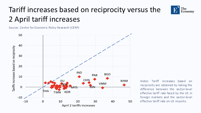 Before January, the average US tariff hovered near 3 %, pushing that rate to 30 %. Critically, as the Figure below shows, the burden is not even allocated according to reciprocity.. Within four months, an overlapping lattice of Section 301 and national security duties pushed that rate close to 30 %, and should Washington lift the 90‑day respite in July, the effective rate would breach 38 %. This drastic increase in tariffs has a significant multiplier effect. For every dollar of tariffs imposed, the overall economic impact is much larger, leading to a substantial decline in welfare.