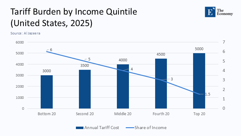 The dual‑axis chart above shows that while top‑quintile households may pay $ 5,000, the cost represents barely 2 % of their disposable income. For bottom‑quintile families, a $ 3,000 hit swallows 6 % of after‑tax pay, crowding out rent, medical co‑pays, or a year of community college tuition.
