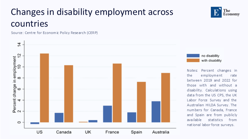 Observers sometimes attribute the U.S. disability surge to idiosyncratic health-insurance rules, but comparative data undermine that claim. Labour-force surveys in Canada, France, Spain, the United Kingdom, and Australia reveal the same pattern: workers with disabilities gained employment three to five times the pace of their non-disabled peers between 2019 and 2022.